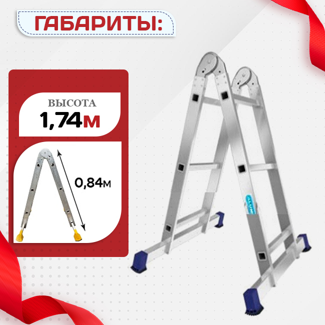 Универсальная шарнирная конструкция позволяет преобразовывать лестницу в двухстороннюю стремянку или обычную приставную лестницу. Широкая траверса обеспечивает устойчивость при проведении работ. Изготовлена из легкого алюминиевого профиля. Может перемещаться и складываться/раскладываться одним человеком. Компактна при хранении и транспортировке.