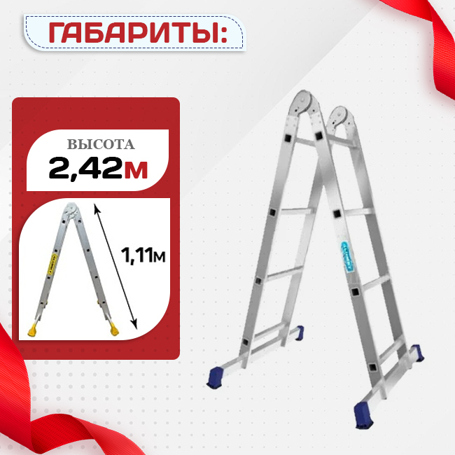 Универсальная шарнирная конструкция позволяет преобразовывать лестницу в двухстороннюю стремянку или обычную приставную лестницу. Широкая траверса обеспечивает устойчивость при проведении работ. Изготовлена из легкого алюминиевого профиля. Может перемещаться и складываться/раскладываться одним человеком. Компактна при хранении и транспортировке.