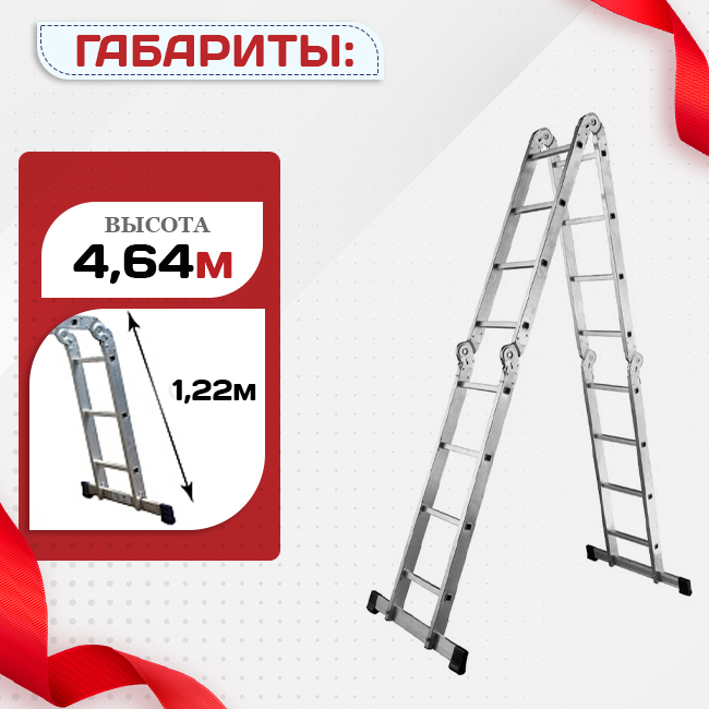 Лестница с трансформирующейся конструкцией состоит из 4-х секций и способна принимать различные положения. Ее можно разложить в стремянку-помост или использовать как обычную лестницу. В любом положении конструкция обеспечивает устойчивость даже на неровных поверхностях. Универсальная лестница, легкая и компактная в собранном виде. Благодаря профилированному алюминию и усиленным поперечинам выдерживает до 100 кг. Устойчива к появлению коррозии.
