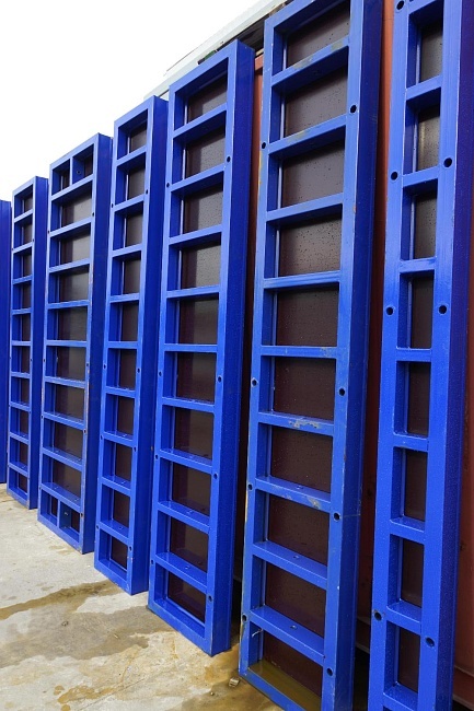 Стальные щиты для возведения прямых монолитных стен универсальны, монтируются как в горизонтальном, так и в вертикальном положениях. Быстро и удобно соединяются замками. Панели или просто щиты транспортируются с помощью захвата монтажного строительного с использованием строп. Противоположные ответные щиты стен крепятся с помощью винтовых стяжек с гайками.